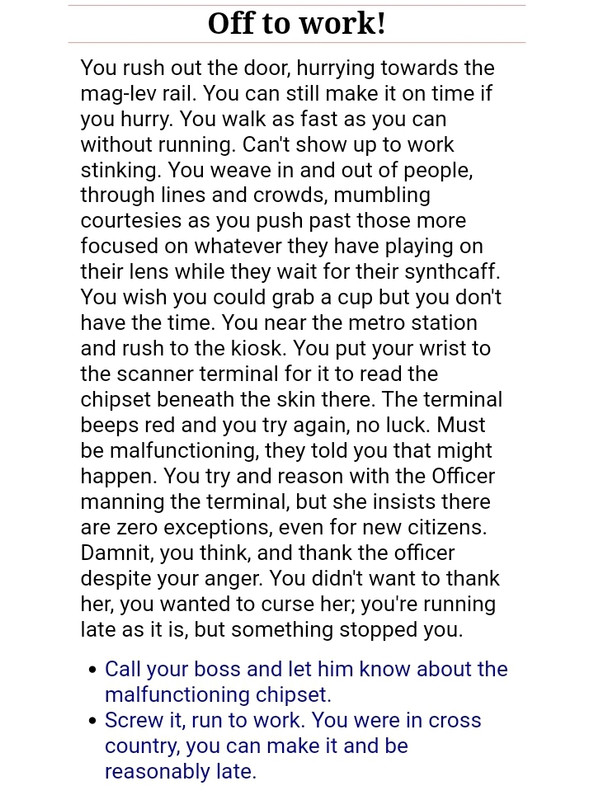 An impressive amount of detail, and way more branches than I could've anticipated. Quality of the writing is the best I've seen so far this whole year, even last spring. Reminds me of A Mind Forever Voyaging, a least a bit. Keep it up, I think you've got more to say in this medium.