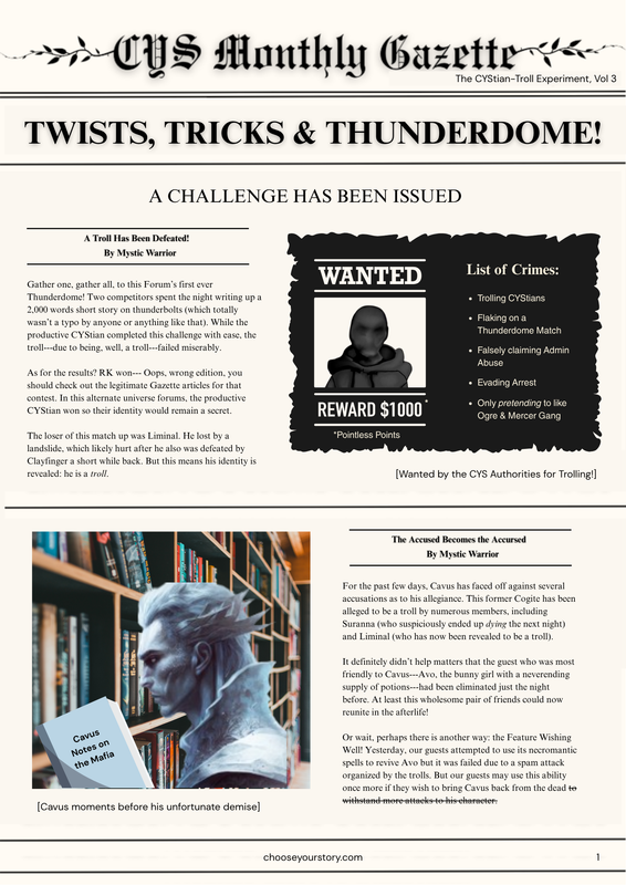 Day 1: Announcements Darkness turns into day. It's the next morning, and fortunately for our guests, the doors have been unlocked at some point in the night! A breakfast of pancakes, sandwiches, and fruits await the guests in News & Updates, along with the newest edition of the CYS Gazette: On cue, an exclamation of surprise comes from the the Writing Workshop! Everyone rushes there to see an excessively gory act of violence that could only be a welcome gift from the trolls. The guests move the @Cat2002116 to the Feature Wishing Well, where she can say her last words (one message) to either impart information to the group or convince them to resurrect her. However, not everyone makes it to the Feature Wishing Well. Where is Liminal? There appears to be a loud pounding against the door in the direction of the Writing Workshop. Everyone rushes there, and thankfully, it is soon revealed that he is not dead, merely trapped in the Pit of Shame. He can still communicate with the other members but cannot participate in voting. Discussion Time! Cast accusations, exchange any information you learned, and most importantly, decide on two important factors: