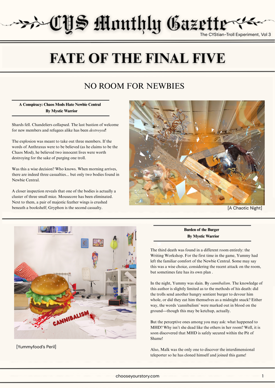 Day 1: Announcements Sunlight filters through the windows. It's the next morning, and our guests find that the doors have mysteriously been unlocked! This time, an English breakfast spread is set out in the News & Updates room, where everyone gathers to read the morning news. It appears that even the trolls' invasion could not stop the publication of the newest edition of the CYS Gazette: (Clickable picture, because it wouldn't be a Gazette edition—or a forgery of one—without it). Within seconds, Jerry and the three mice appear, carrying the first victim of the trolls' attack into the room. @MiltonManThing is moved to the Feature Wishing Well where he can say his last words (one message) to either impart information to the group or convince them to resurrect him. However, as the group gathers around the well, they soon realize there are only eleven of them. Yes, this includes the almost-dead person who has been disposed of in the well. A quick search of the premises reveals that Gryphon has been locked up in the Pit of Shame! As such, they cannot participate in any form of voting until the next day, but can communicate with the group by shouting over the voices of the other shamed individuals. Discussion Time! Cast accusations, exchange any information you learned, and most importantly, decide on two important factors: