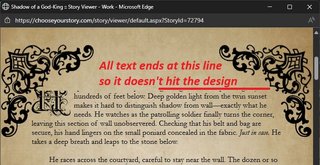 Glad you figured it out :) Edit: I glanced at your story and realized I forgot to mention that for some reason, the picture repeats instead of filling the screen. I personally choose pictures that look alright if they repeat (e.g. solid colours or patterns) but maybe someone else on the site would know how to stretch a background picture to fit the page.