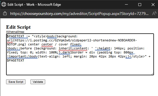 $ PAGETEXT := "< style >body{background: url(https://i.postimg.cc/G2Vqm2wG/oldpaper12-shortenednew-NOBOARDER-NOTOP.png) center center / cover fixed; }body::before {background: inherit;content: ' ';height: 146px; position: fixed; top: 0; width: 100%;}.dark1border + div {padding top: 800px !important;}body{text-align: left; margin: 20px 42px 20px 42px;} < /style >" + $ PAGETEXT