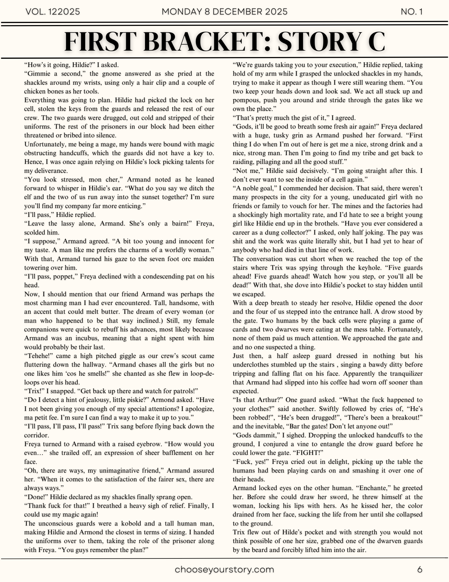 Story C is the one that held my attention the longest. It was a creative use of the prompt and the story has a well-developed voice.